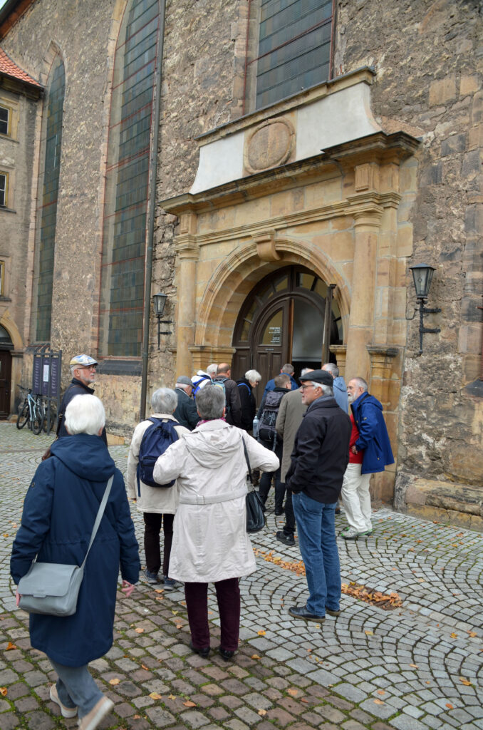 Am Donnerstag stand eine Exkursion nach Gotha auf dem Programm. Im Augustinerkloster wurden wir von Superintendent Friedemann Witting empfangen mit einer Andacht zur aktuellen Herausforderung von Jesu Gebot der Feindesliebe. Anschließend informierte er über die Geschichte des Klosters, das im 13. Jahrhundert gegründet wurde. Erster Gothaer Superintendent war Friedrich Myconius (1490-1546), ein enger Mitarbeiter Martin Luthers. In einer Gesprächsrunde im Gemeindesaal berichtete Herr Witting über die aktuelle Situation im Kirchenkreis Gotha. In den vier Regionen arbeiten die Pfarrerinnen und Pfarrer in Teams zusammen mit individuellen Schwerpunkten. Vakanzen gibt es nicht, die EZG ist noch nicht angefragt worden. Das kann sich ändern, wenn mehrere Pfarrer in den Ruhestand gehen.